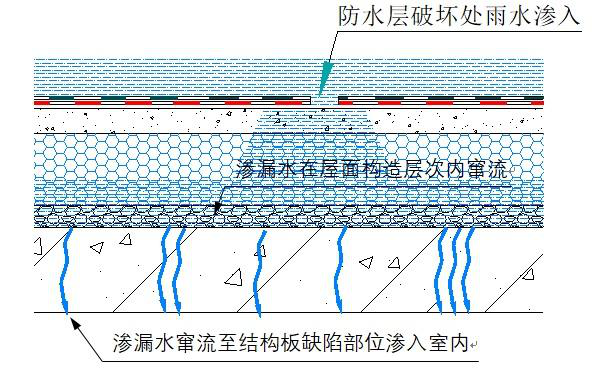 3) 防水層與屋面結(jié)構(gòu)板之間的保溫層、找坡層等構(gòu)造體系內(nèi)存在松散多孔空間,滲漏水能夠在構(gòu)造層內(nèi)大量集聚、蔓延擴散,造成大面擴散性滲漏水(竄水現(xiàn)象)。