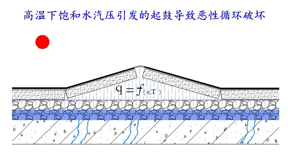 6) 高溫氣候下,屋面構(gòu)造層內(nèi)蒸汽壓升高引發(fā)屋面壓覆找平層起鼓破壞、再次損傷防水層,且這種現(xiàn)象呈惡性循環(huán)狀態(tài)。
