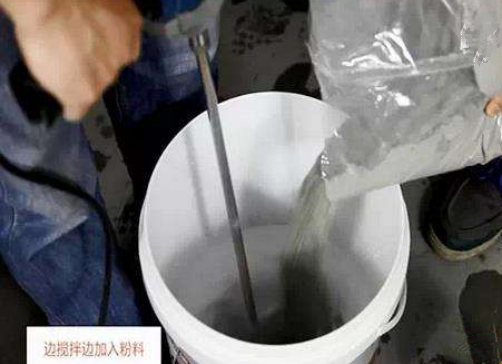 表面處理好后就可以開(kāi)始調(diào)配好防水材料了,按照1:4的比例配制好,也不需要其他的溶劑,將產(chǎn)品中的搭配好的兩個(gè)組份進(jìn)行不斷攪拌,直至糊狀即可。