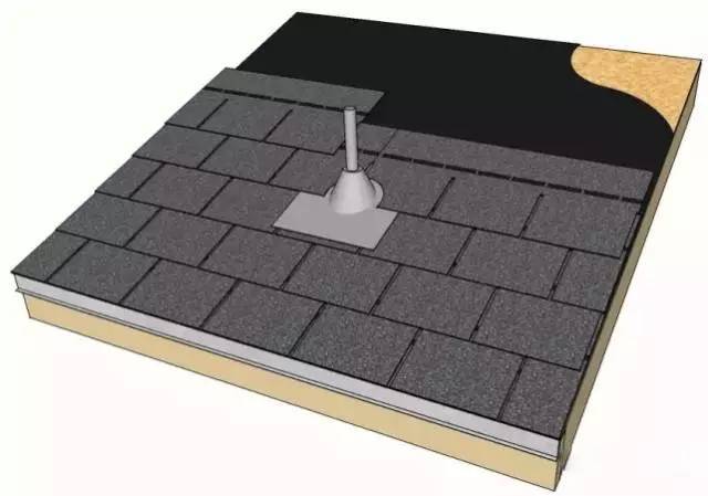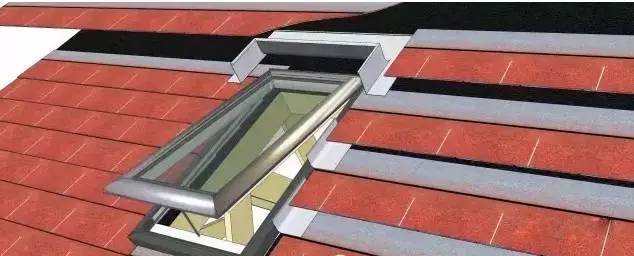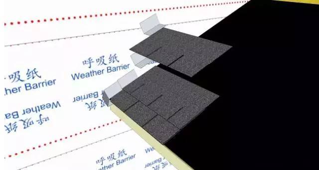 很多施工人員使用整條的金屬泛水板或防水卷材安裝在墻體與屋面的交接位置,但這會(huì)使從瓦片邊緣流入下方的水再無法被帶回到瓦片上方。這就大大增加了漏水的可能性,而階梯式泛水板是解決該問題的最佳選項(xiàng),且其安裝過程并不會(huì)過于繁瑣。標(biāo)準(zhǔn)瀝青瓦上的階梯式泛水板長(zhǎng)度約180mm,公制瀝青瓦上的階梯式泛水板長(zhǎng)度約200mm。