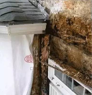 起始條瀝青瓦之間的接縫和第一道瀝青瓦之間的接縫剛好重合會(huì)導(dǎo)致漏水,這種情況出奇的多。這種布置會(huì)造成檐口每900mm出現(xiàn)一處漏水點(diǎn),導(dǎo)致椽條尾部、墻體覆面板、頂梁板和石膏板全部潮濕并腐爛。