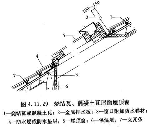 4.11.29 燒結(jié)瓦、混凝土瓦與屋頂窗交接處,應(yīng)采用金屬排水板、窗框固定鐵腳、窗口附加防水卷材、支瓦條等連接(圖4.11.29)。