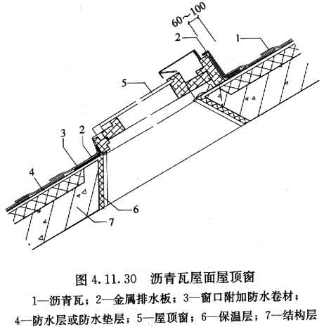 4.11.30 瀝青瓦屋面與屋頂窗交接處應(yīng)采用金屬排水板、窗框固定鐵腳、窗口附加防水卷材等與結(jié)構(gòu)層連接(圖4.11.30)。