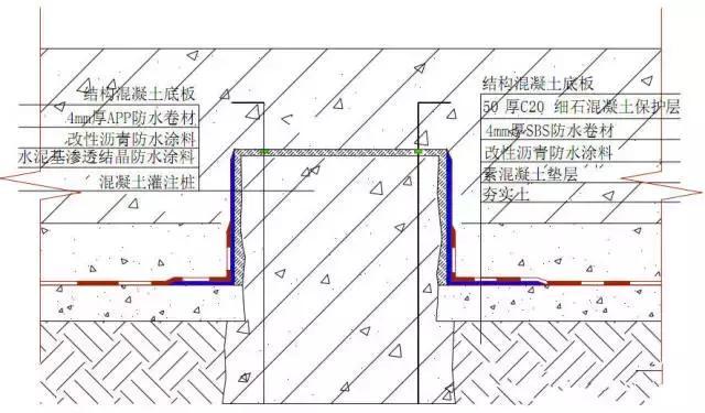 采用水泥基滲透結(jié)晶型防水涂料 +改性瀝青防水涂料 +卷材的復(fù)合防水做法。: