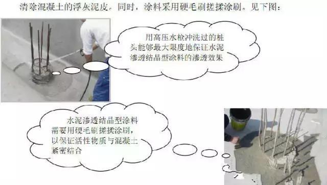 1、樁頭防水處理的關(guān)鍵是樁頭的清理工序,采用高壓水槍沖洗樁頂面混凝土能夠有效清除混凝土的浮灰泥皮。同時(shí),涂料采用硬毛刷搓揉涂刷。見下圖: