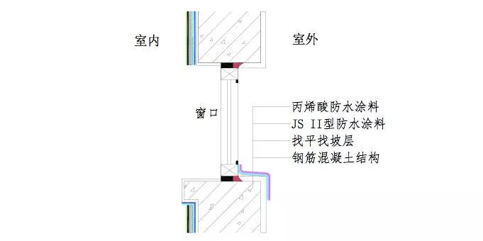 2)窗臺向外找坡,先用柔性防水涂料打底,涂膜厚度1.0mm,然后涂刷外露丙烯酸防水涂料,此時采用“一布兩涂”的方法,外露型丙烯酸防水涂料中間內襯網(wǎng)格布做增強處理,完全干燥后再涂刷一遍丙烯酸防水涂料,丙烯酸涂膜最終厚度1.5mm。