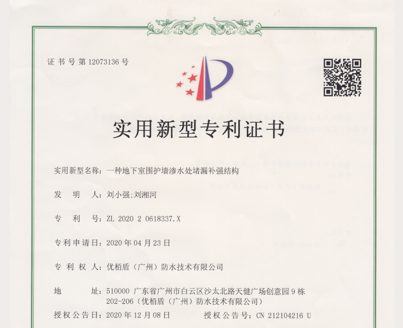 熱烈祝賀優(yōu)栢盾(廣州)防水技術有限公司榮獲《一種地下室圍護墻滲水處堵漏補強結構》專利號:ZL 2020 2 0618337.X 實用新型專利證書。我司優(yōu)栢盾一直十分注重知識產(chǎn)權管理體系的創(chuàng)建和完善,我們秉承“以人為本、誠信為重,技術為先,品牌為主”的企業(yè)發(fā)