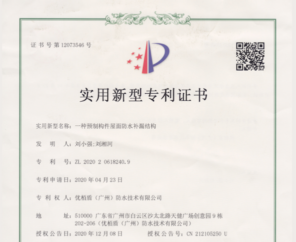 熱烈祝賀優(yōu)栢盾(廣州)防水技術有限公司榮獲《一種預制構件屋面防水補漏結構》專利號:ZL 2020 2 0618240.9實用新型專利證書?!兑环N預制構件屋面防水補漏結構》專利號:ZL 2020 2 0618240.9我司優(yōu)栢盾一直十分注重知識產(chǎn)權管理體系的創(chuàng)建和完善,我們秉承“以人為本、誠信為重,技術為先,品牌為主”的企業(yè)發(fā)展理念,我們堅